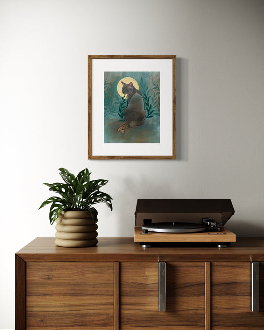 Mystical Luna Black Cat Art Print – Digital Painting Wall Decor | Moonlight Cat Illustration in 5x7, 8x10, 11x14