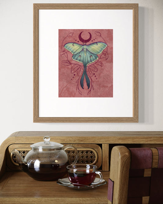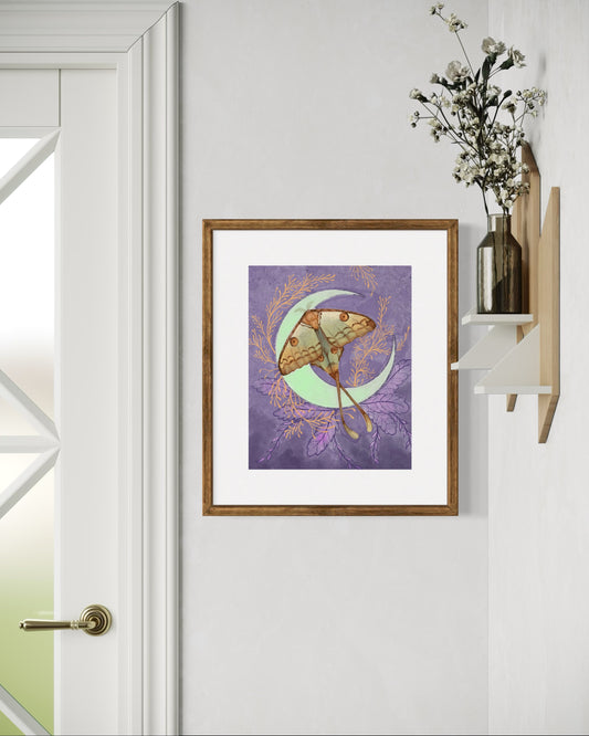 Luna Moon Moth – Digital Art Print | Celestial Insect Illustration with Crescent Moon | Available in 5x7, 8x10, 11x14