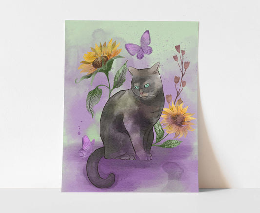 Mystical Black Cat with Sunflowers – Digital Art Print | Whimsical Cat & Butterfly Wall Decor | Available in 5x7, 8x10, 11x14