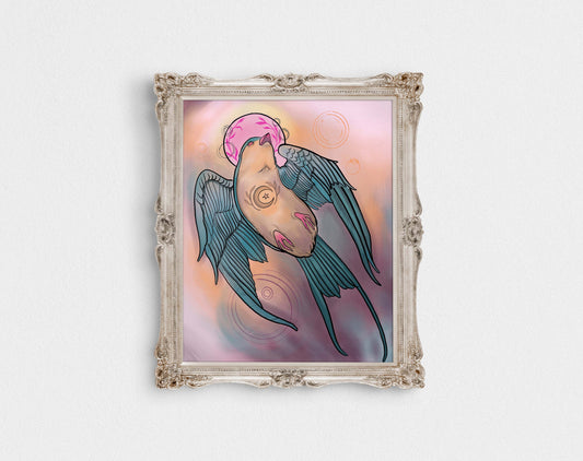 Celestial Swallow – Digital Art Print | Mystical Bird Illustration with Moon & Star Symbol | Available in 5x7, 8x10, 11x14