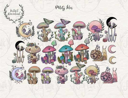 Colourful Mystical Mushrooms Clipart, Fall Forest Fungus Clipart, Mushroom Woodland, 21 png files, INSTANT DOWNLOAD