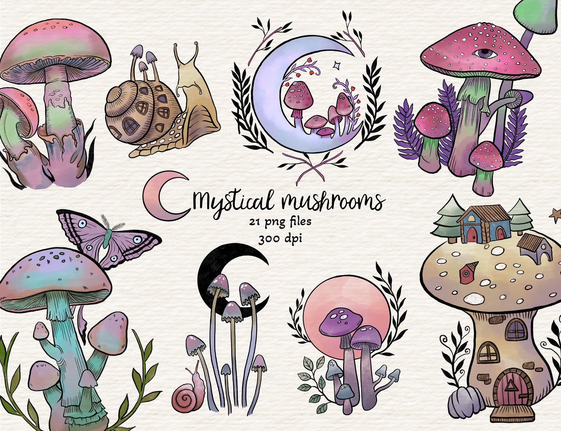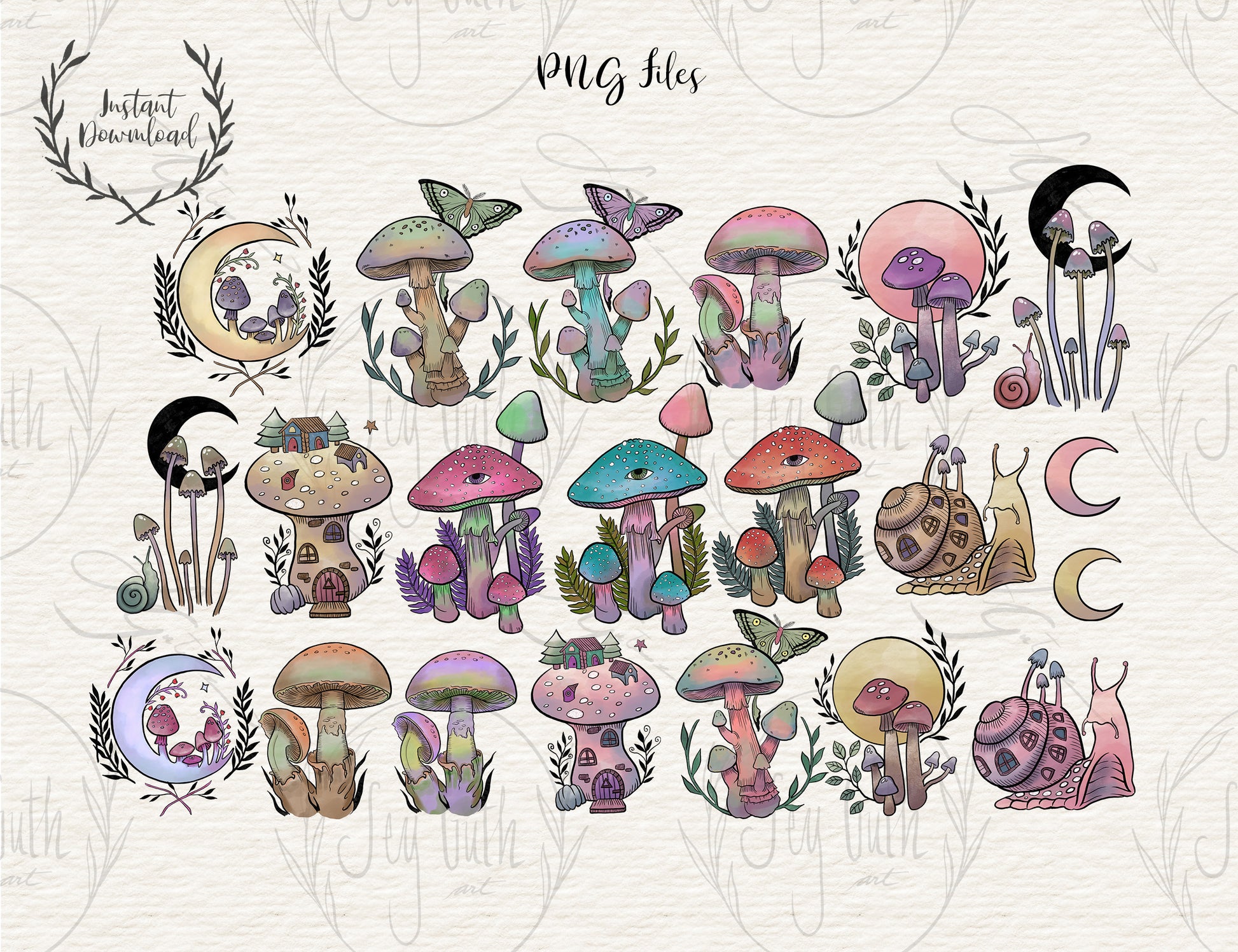 Colourful Mystical Mushrooms Clipart, Fall Forest Fungus Clipart, Mushroom Woodland, 21 png files, INSTANT DOWNLOAD