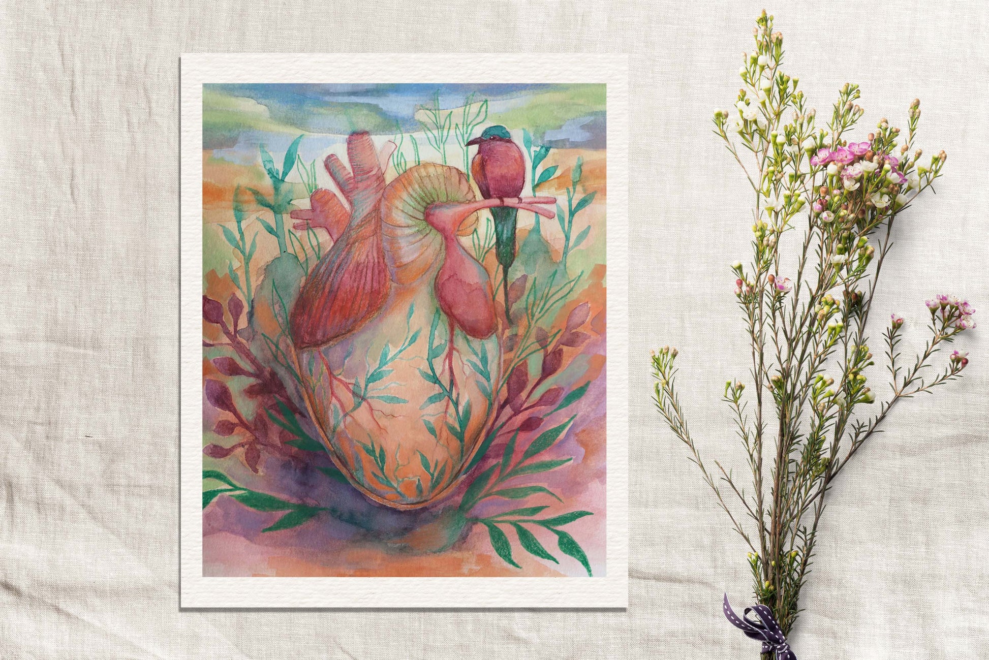 Heart & Bird – Watercolor Art Print | Surreal Anatomical Heart Painting with Nature Elements | Available in 5x7, 8x10, 11x14