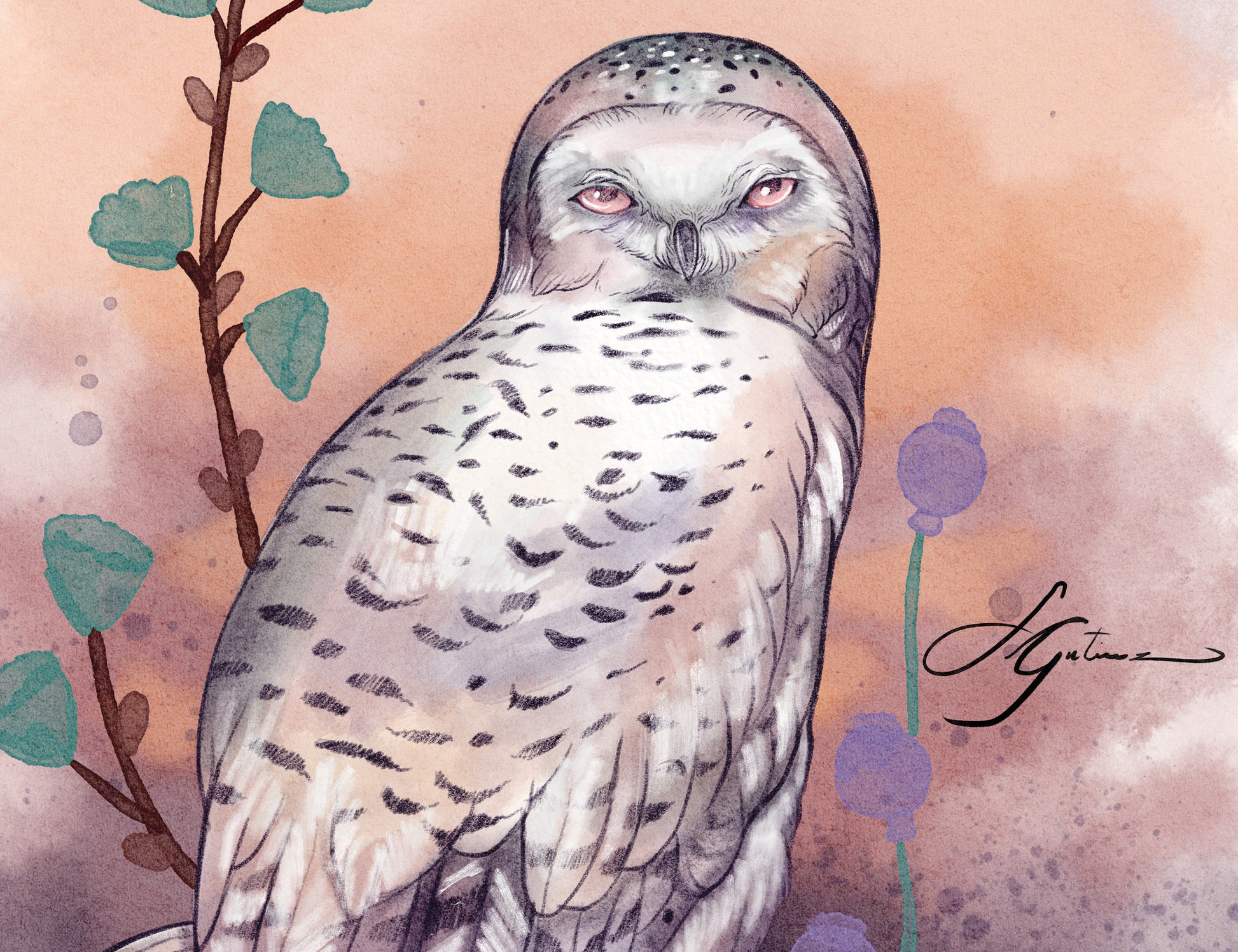 Bring wisdom and stillness into your space with Snowy Owl Watcher, a captivating digital art print featuring a regal snowy owl perched on a twisted branch. With soft sunset hues, detailed feathers, and dreamy botanical accents, this piece captures the silent strength of this majestic nocturnal bird. A perfect choice for nature lovers, owl enthusiasts, and cozy, magical spaces.